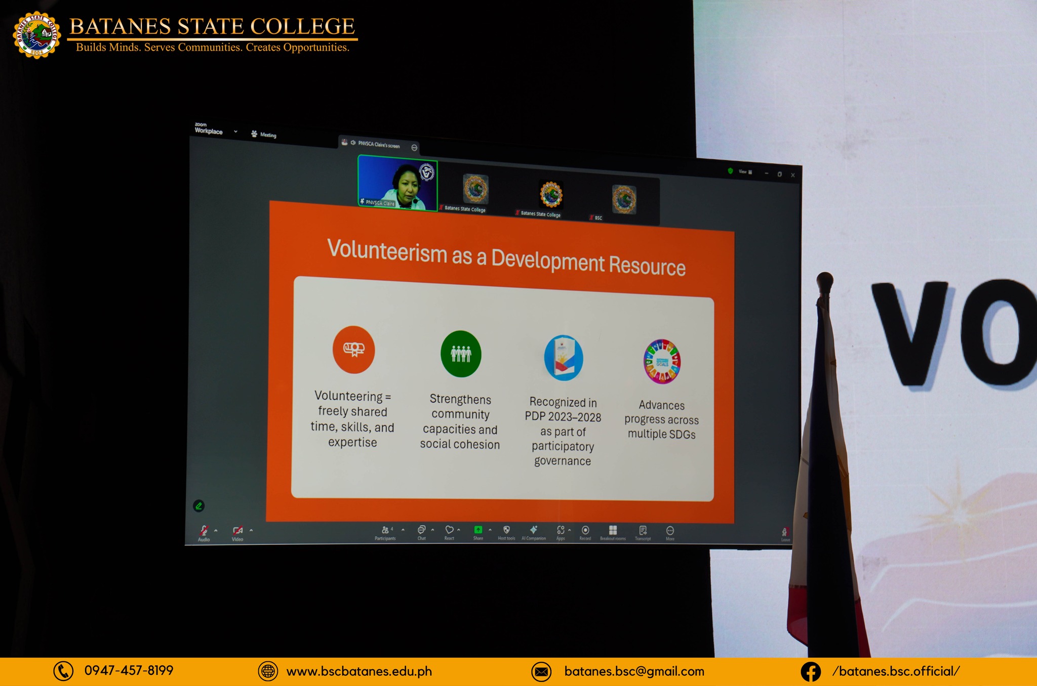 The esteemed Resource Speaker, Ms. Claire S. Pantoja, an officer of PNVSCA, shared her expertise in volunteerism, motivating the academic community to actively contribute to inclusive development and help build a resilient future for everyone.