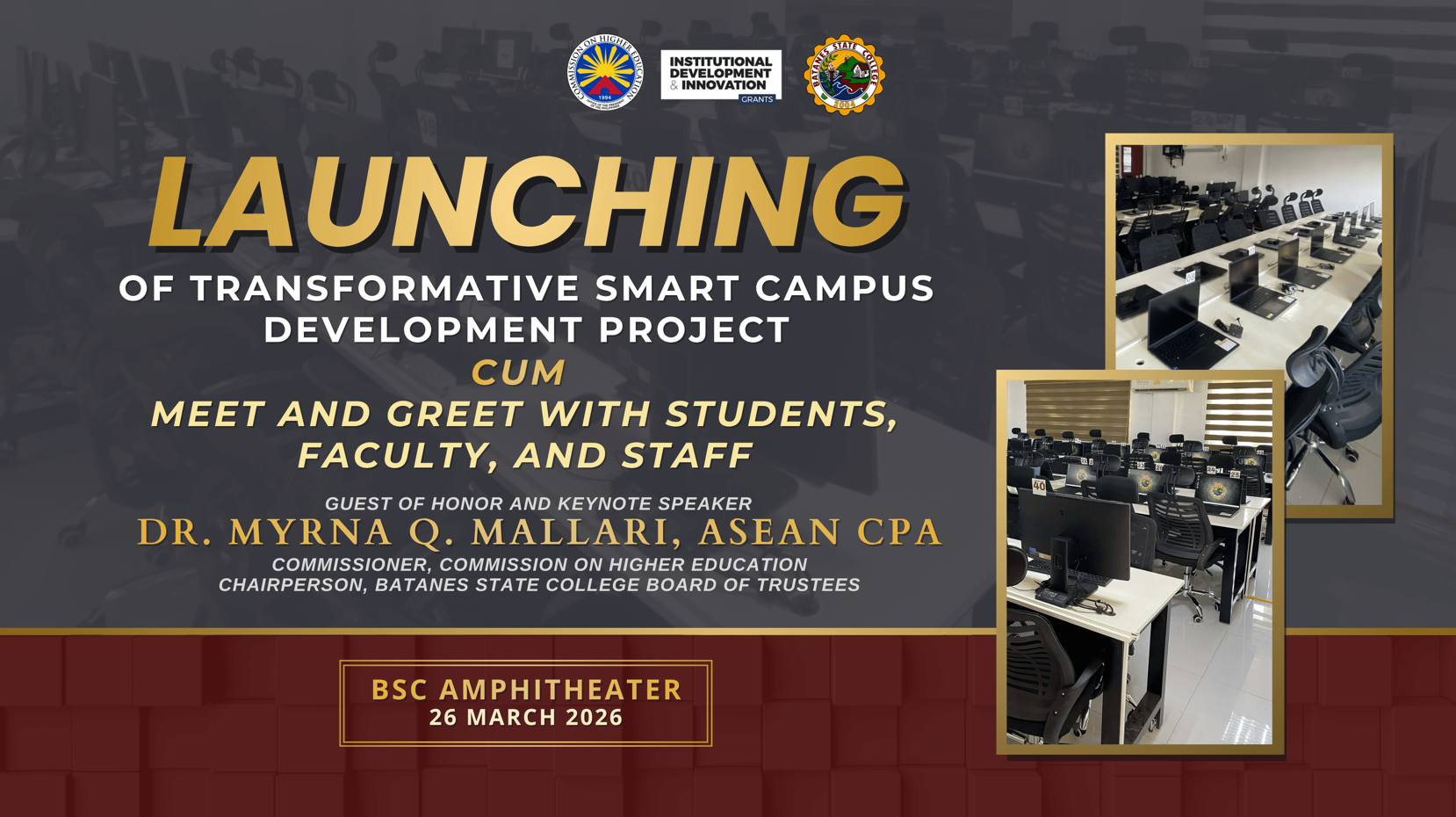 Batanes State College (BSC) officially launched Phase 1 of its “Transformative Smart Campus Development: Enhancing Educational Excellence through Upgraded Facilities” Project on March 26, 2026, at the BSC Amphitheater, followed by a ribbon-cutting ceremony and the unveiling of the project marker. Funded under the CHED Institutional Development and Innovation Grant (IDIG), the 15 Million Pesos continue reading : BSC officially launched Phase 1 of its Transformative Smart Campus Development Project