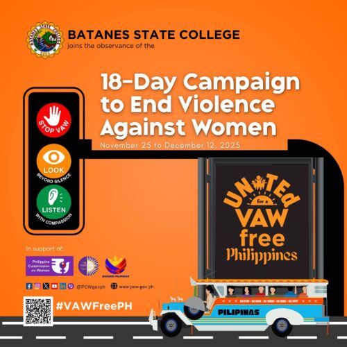 Batanes State College (BSC) headed by the College President, Dr. Djovi R. Durante, held the Ceremonial Kick Off of the 18-Day Campaign to End Violence Against Women, today, November 24, 2025, led by Ms. Zoe Dympna H. Cartaño, BSC GAD focal person. A short orientation about “Men Opposed Violence Against Women Everywhere (MOVE) was given continue reading : BSC joins the observance of the “2025 18-Day Campaign to End Violence Against Women”